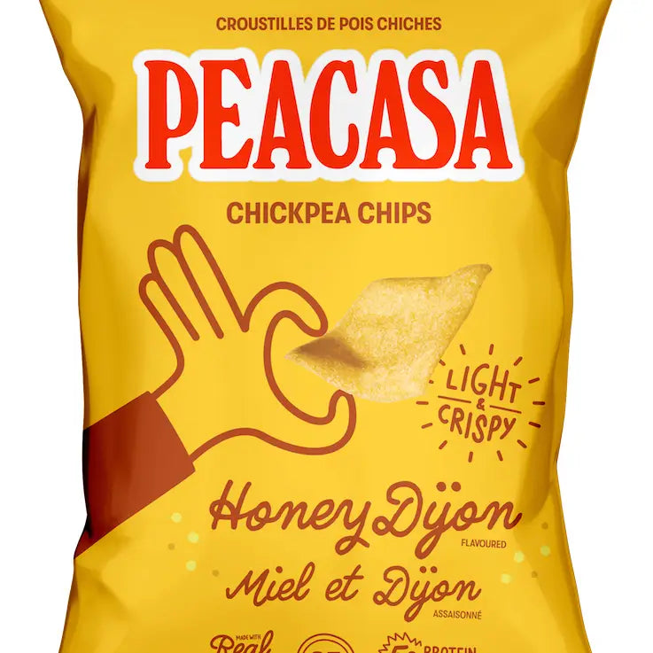 Peacasa Chickpea Chips, available in Honey Dijon or Sea Salt, are expertly crafted in Canada from nutrient-rich chickpeas. These mini bags offer a flavorful, protein-packed snack with a satisfying crunch—Honey Dijon delivers a balanced blend of sweetness and tang, while Sea Salt provides a clean, savory taste. Ideal for health-conscious consumers seeking a delicious alternative to conventional chips rich in plant-based protein and fiber.